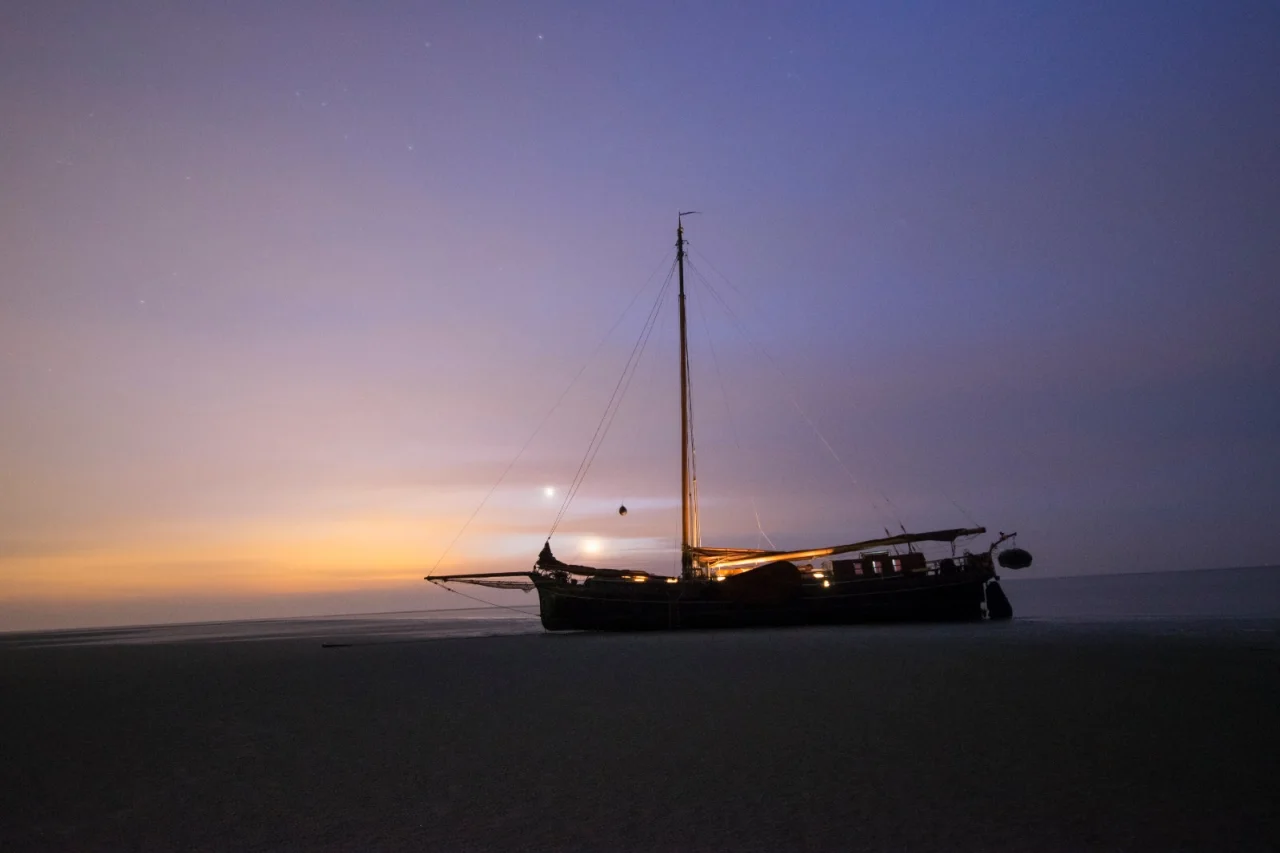 Flat-bottomed ships such as the Willem Jacob and the Minerva are made to run aground. When running aground, the ship sails above a sandbank at high tide. Because the water level drops, the ship ends up on the sandy bottom of the Wadden Sea. You can then disembark and walk across the seabed.