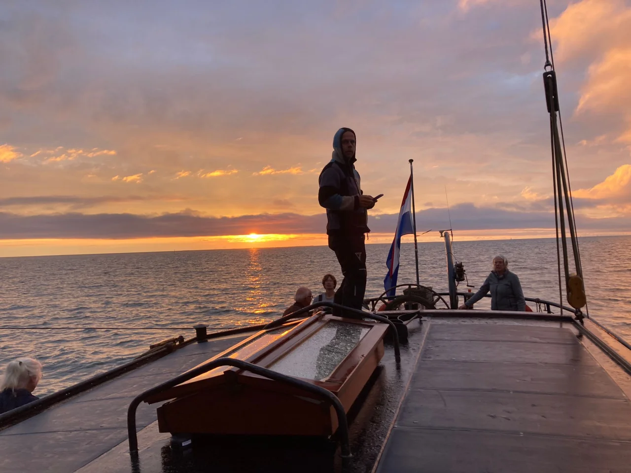 Om 19:00 uur (Vroeg in het seizoen soms eerder in verband met de vroeg invallende duisternis) wordt je verwelkomt door onze bemanning met koffie/thee/water of limonade. Na de uitleg van de bemanning zetten we zeil voor een prachtige tocht over de waddenzee. Je mag meehelpen met het zeilen, maar stil genieten van de omgeving kan ook. Het is lekker rustig op het water, terwijl de omgeving steeds meer prachtige tinten krijgt van de ondergaande zon. Rond 22:00 meren we weer aan in de haven van afvaart en eindigt je avontuur weer.