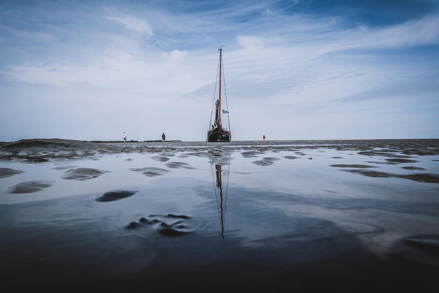 Zorg wel dat je bij het opkomend water weer aan boord bent. Door de vloed komt het schip weer los en zeilen we verder. Na een paar uur vervolgen we onze zeiltocht. Hoe lange het droogvallen duurt, hangt af van waar we op de zandplaat liggen.