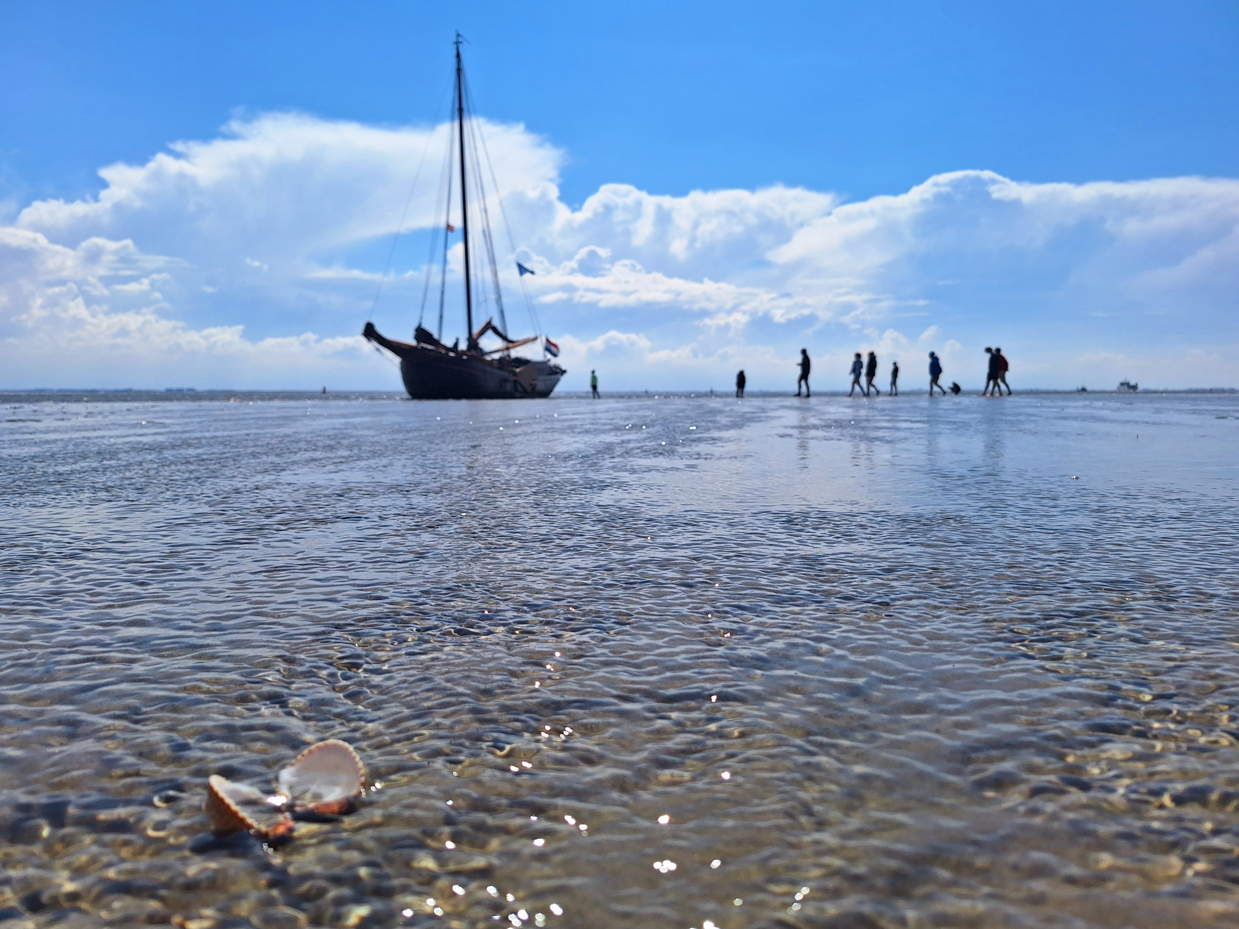 Zorg wel dat je bij het opkomend water weer aan boord bent. Door de vloed komt het schip weer los en zeilen we verder. Na een paar uur vervolgen we onze zeiltocht. Hoe lange het droogvallen duurt, hangt af van waar we op de zandplaat liggen.